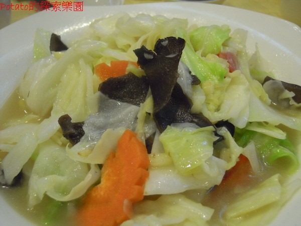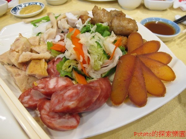 六色拼盤,NTD700。照片中從右邊順時針算過來有烏魚子、香腸熟肉、蟳丸、冷筍飽魚(長條狀)、軟絲、蝦棗,中間有泡菜。個人覺得除了烏魚子之外,其他的菜色都只能說口感普通,建議單點烏魚子就好了。阿霞飯店雖然是以「香腸熟肉」起家,但個人不合這道菜的胃口,粉腸吃起來不同與一般的香腸口感,反而有點粉粉脆脆的,實在不習慣。