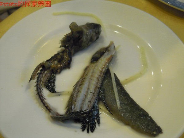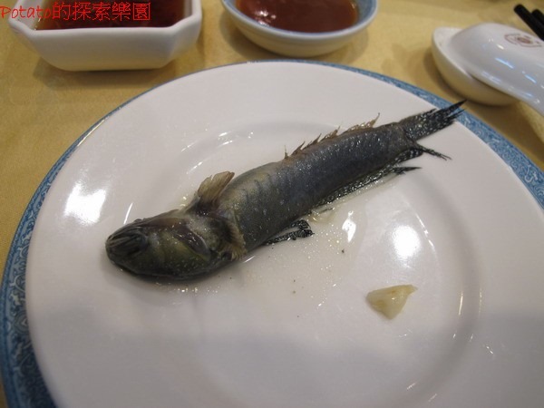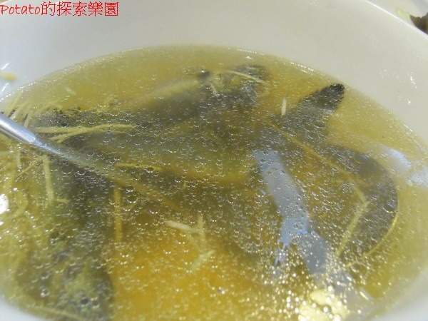 薑絲花跳,NTD500。花跳就是「彈塗魚」,好簡單的一道菜,裡頭大概只有六支彈塗魚左右。服務員還會教我們如何吃這彈塗魚,把彈塗漁撈到盤子上,然後拿湯匙押著並用筷子從魚肚的地方將彈塗魚一分為二,然後去骨。湯頭鮮甜,個人超推薦這道湯品。