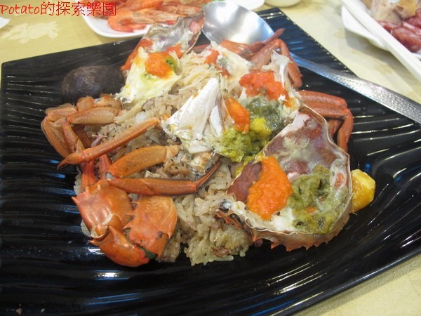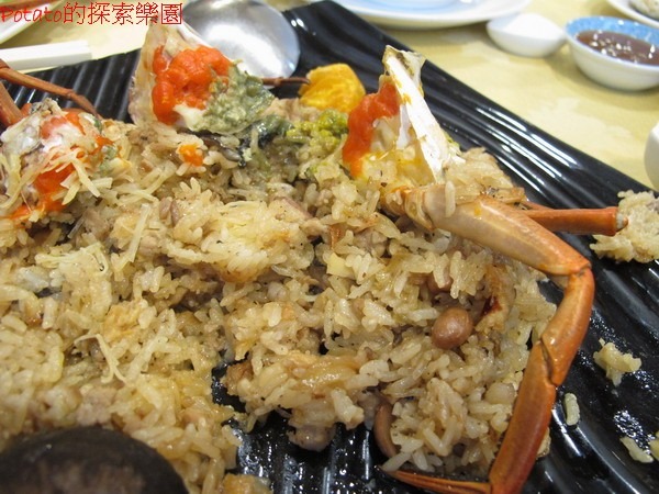 紅蟳米糕(小),NTD900,選用蟹黃飽滿的紅蟳二隻生切,上等的糯米蒸熟後,加入高山香菇、蝦米、肉絲、蔥酥攪拌,再加上紅蟳於米糕上炊蒸,米香蟹肥,令人食指大動,米粒分明帶有蟹肉香,來這裡必點菜喔。