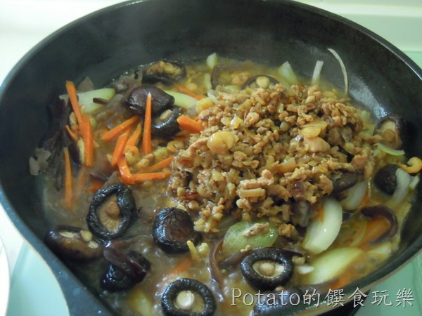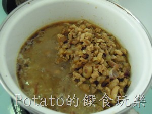 4.放入肉燥及一碗水,肉燥有醬油鹹味,嚐一下味道後再適度調味。