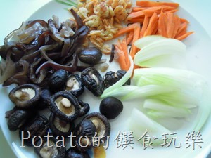 準備材料:米粉、紅蔥頭肉燥、木耳絲蝦米、香菇、紅蘿蔔絲、洋蔥、豆芽菜及韭菜。