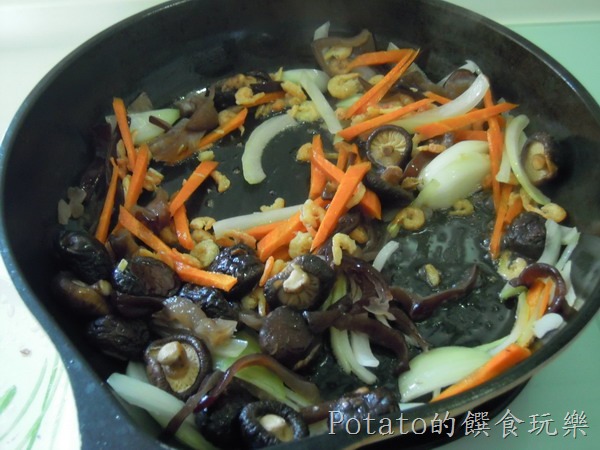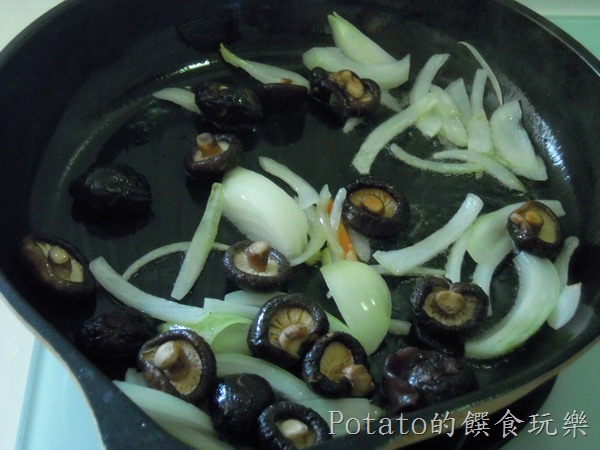 2.開中火1匙油,先將洋蔥絲及香菇爆香。