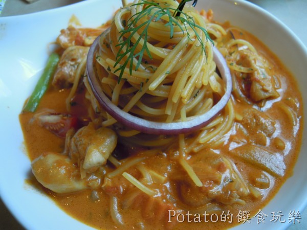 4.粉紅玫瑰醬汁–香煎雞小腿佐奶香番茄義大利麵$369元(套餐),味道很棒。