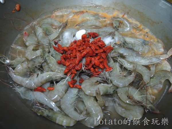 1.準備材料:白蝦2斤、米酒頭1瓶、枸杞少許、鹽巴2匙。