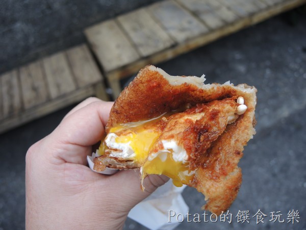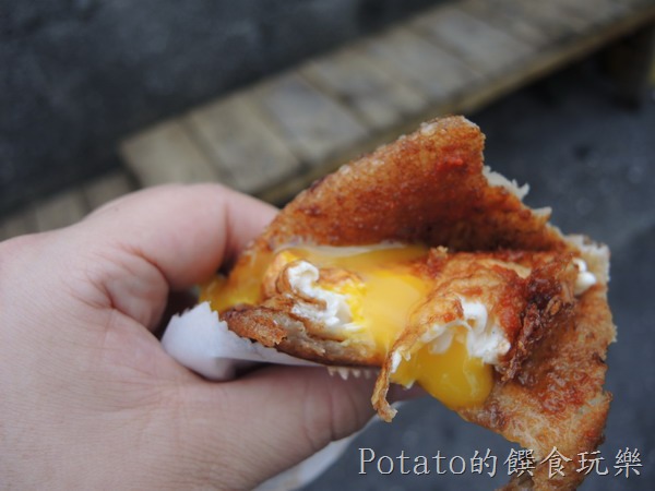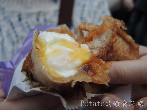 兩家的炸蛋蔥油餅價格一樣,蛋要全熟要事先講,平常日大概要等10-20分,假日聽說要等半小時以上,吃的時候要小心蛋汁流出來。