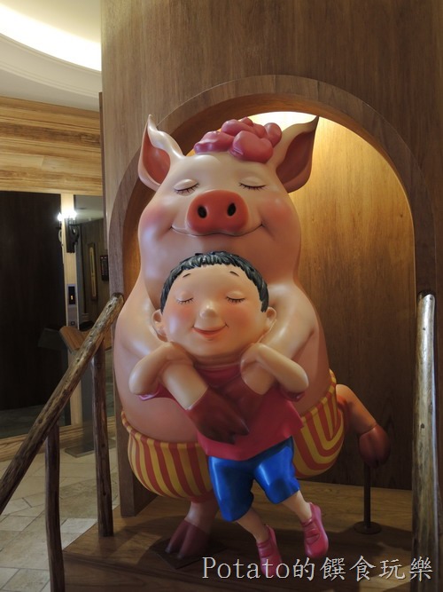 1.2櫃檯前–可愛的粉紅豬擁抱想要飛翔的小男孩。