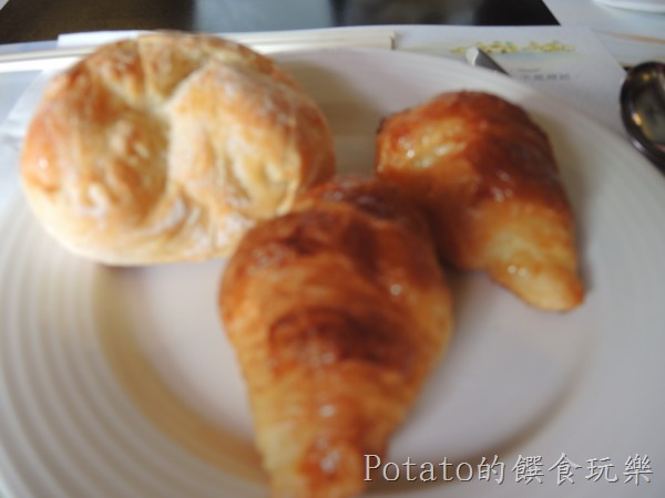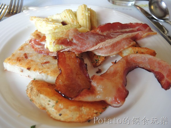 4.我們的豐盛早餐–可頌、手作麵包、培根、玉米筍、蘿蔔糕等。