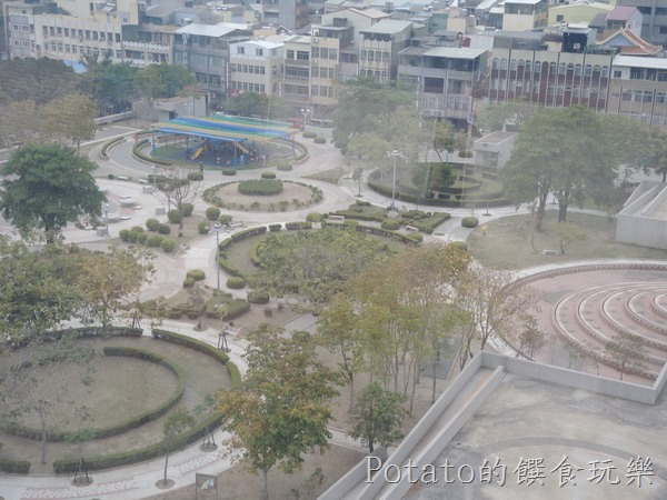 10.因為吃得很飽,拿一些水果,看著高樓下的風景–公11停車場公園及忠義國小。