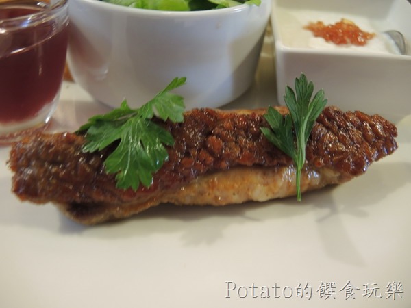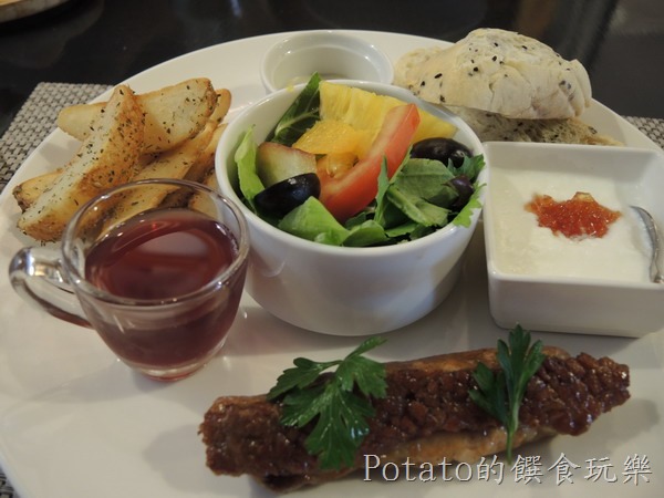 櫻桃鴨胸餐點內容:櫻桃鴨胸、時蔬沙拉、手工薯角、手工優格、麵包,有機咖啡或大吉嶺紅茶(二選一)。