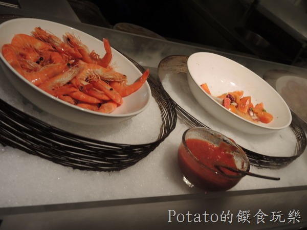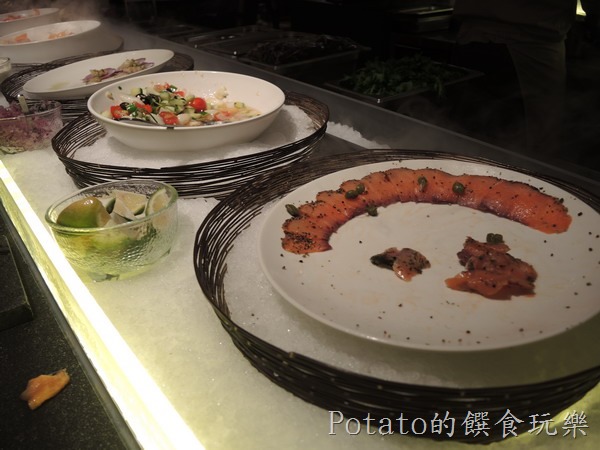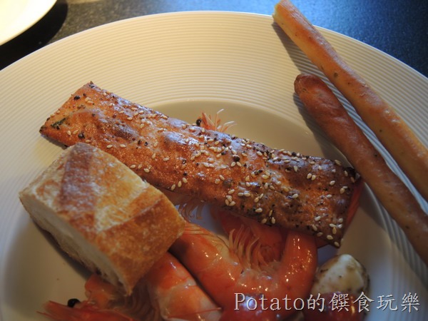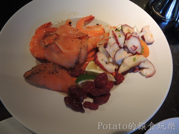 1.沙拉吧的菜色–醃燻鮭魚、涼拌章魚、白蝦、生菜、麵包。
