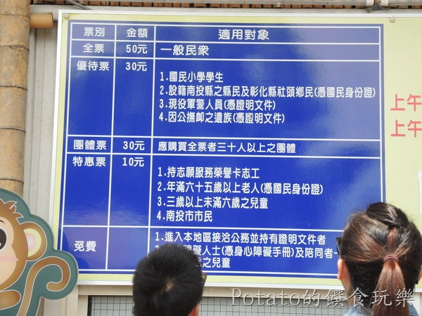 特惠票10元:南投市民、身心障礙者及陪同者一名、年滿65歲以上老人、學齡前兒童