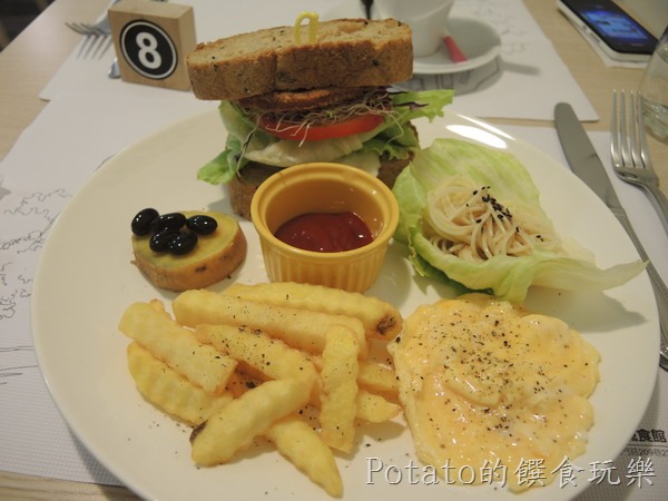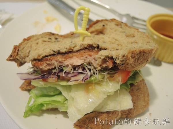 A餐左右美式拼盤$190元–雜糧土司夾著素火腿肉、生菜包著胡麻醬的細麵,我第一次吃素食的早午餐,非常驚奇及大讚美味。