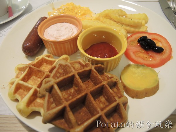 B餐法蘭朵經典早餐$210元–鬆餅是軟帶香,沾這自製優格醬,非常美味,旁邊有一條煙燻素香腸,很特別的組合。