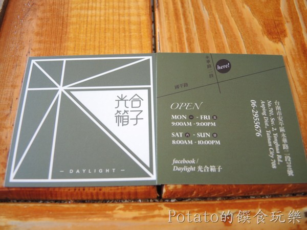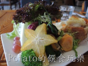 住在台南安平的同事,好康逗相報,安平有一家蔬菜多多的早午餐『光合箱子』,餐廳寬敞、舒適迷人,找一個休假早上去探險一下,Brunch價位在270-320元,附餐飲料是日月潭紅茶或美式咖啡,另外加80元,可點選任一飲料,沒有濃湯,有一大盤的蔬果,喜歡蔬果的朋友一定很喜歡。
