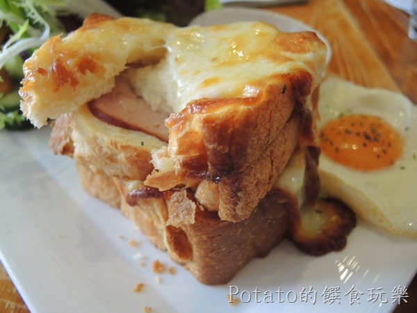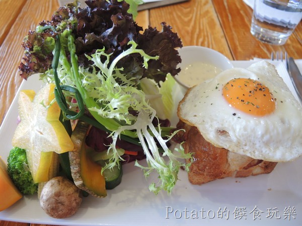 脆皮女士的秘密$270元,自製吐司配上法式火腿、起司、太陽蛋,附上季節綠葉沙拉,搭配清爽的優格,真是美味。