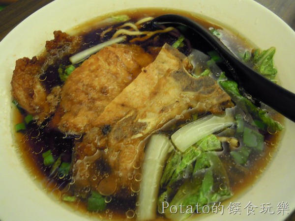 7/26日天氣晴,正午時分在八里騎完腳踏車,買了想念許久的「雙胞胎」;跟大學同窗好友相約見面吃飯,雖然是非假日,已經一點多,淡水老街還是人滿滿滿,來黑店一定要吃招牌『帶骨排骨飯』,醃過的排骨下去炸,香嫩可口且保有肉汁,搭配酸菜滷豆腐丁,真是一級棒,超推薦來黑店用餐,保證你會回味無窮、還想再來喔。
