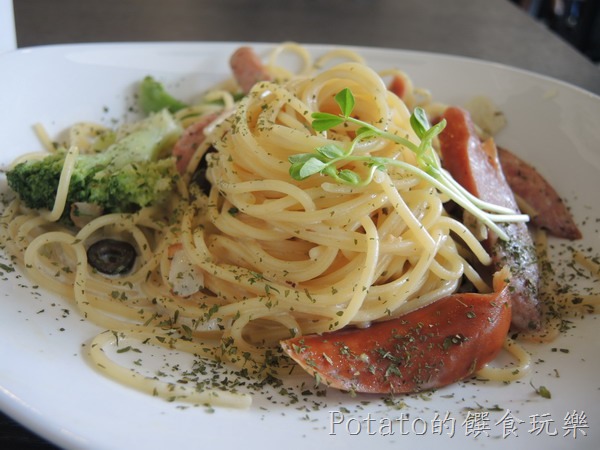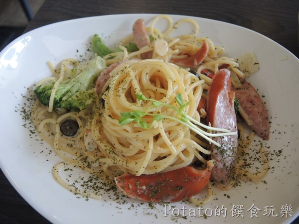 《初食手作廚房》我點的午餐-白醬德式香腸義大利麵NT170元,很美味的喔。