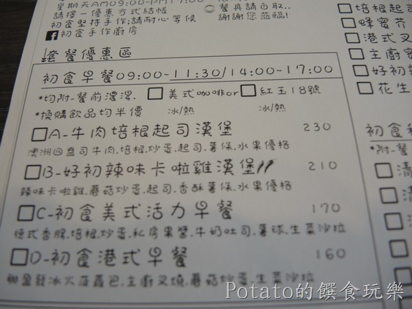 初食早餐時段:09:00-11:30 ‧14:00-17:00,分別為A.牛肉培根起司漢堡(NT230),B.好初辣味咖拉雞腿堡(NT210),C.初食美式活力早餐(NT170),D.初食港式早餐(NT160)。