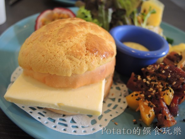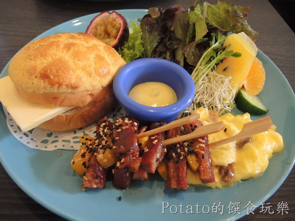 初食港式早餐,NT160。有冰火波羅包、叉燒肉串燒、蘑菇炒蛋、生菜沙拉等。老爺覺得這個『聯盈發』的冰火波羅包不夠道地好吃,波羅油要好吃,波羅麵包一定要烤得酥脆,然後放上冰涼的鹹奶油片, 一熱一冷稱之「冰火」,但是我沒吃過道地波羅油,所以我覺得OK。另外叉燒肉串燒也有點冷掉了,炒蛋非常滑順好吃。