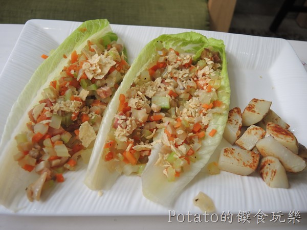 用蝦鬆的概念,以蘿蔓當底,雞腿丁及豆皮、胡蘿蔔丁及西洋芹,馬鈴薯塊,很清爽可口,但很容易菜菜掉滿地。