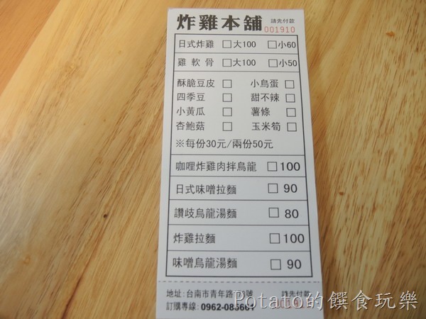 台南市青年路有一台攤車,賣的是日式炸雞及拉麵,每天很多人排隊;最近攤車不見了,問一下附近的人,原來轉入巷內營業,果然是升級了,而且有店名,叫做《炸雞本舖》,日式炸雞不錯吃,拉麵還可以,招牌的『炸雞咖哩烏龍麵』沒吃過,下次再來嚐嚐看。