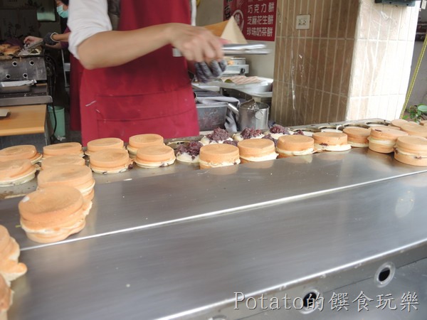 『萬丹老李紅豆餅』的口味有紅豆、奶油、芋頭、菜脯、巧克力、芝麻花生、珍珠奶茶等口味,口味很多樣,我們買紅豆餅和芝麻花生餅。