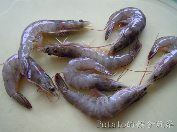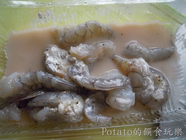 1.鮮蝦剝殼去蝦頭後,從蝦身中間給一刀,順便去挑腸泥,放一些米酒去腥,加一些胡椒粉、太白粉後備用。