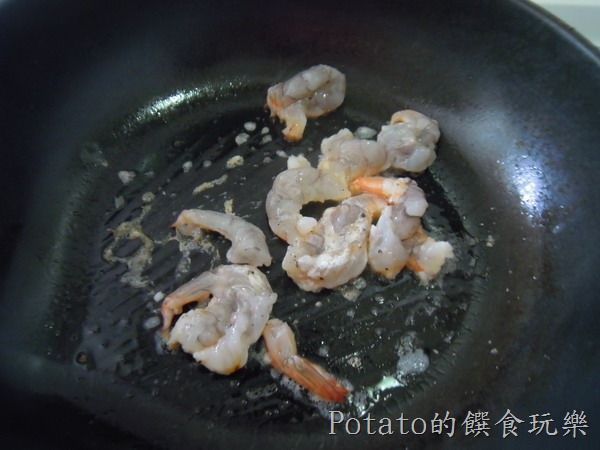 2.用一匙油,煎蝦仁至八分熟。