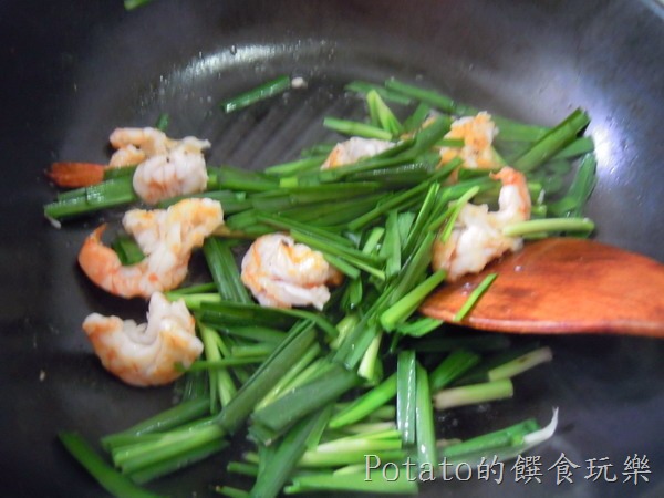 3.加入韭菜翻炒一下,加1匙的鹽巴,在翻炒1分鐘後熄火起鍋。