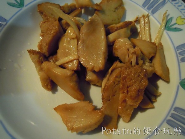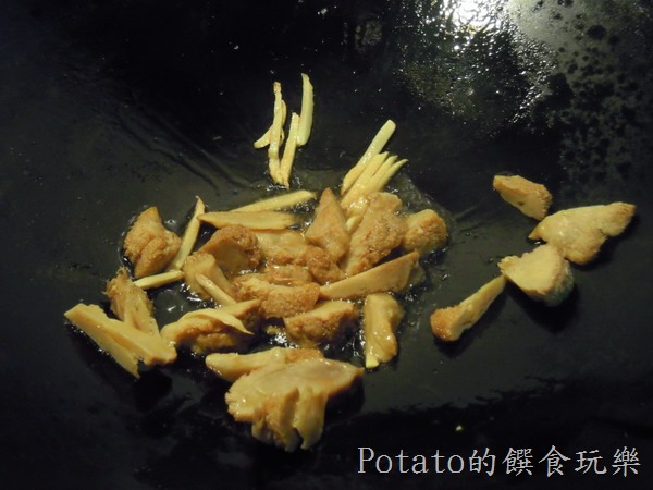 1.用一匙油、將猴頭菇片及薑絲爆香,撈起至盤中備用。
