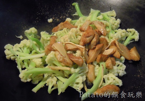 3.放入剛剛備用的猴頭菇片,拌炒一下後調味,鹽巴少許讓花椰菜有味道,鹽巴放太多,菜容易死鹹。