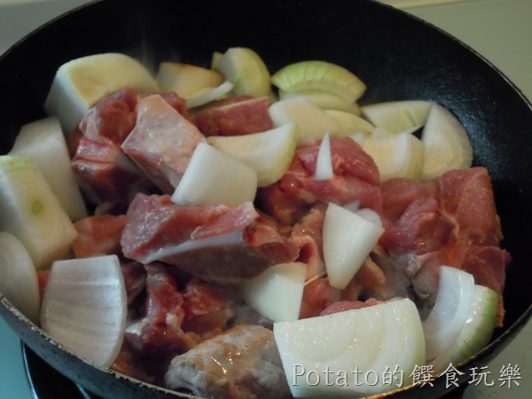 1.先用1匙油將洋蔥及豬軟骨油煎,洋蔥煎軟,豬軟骨煎至微黃。