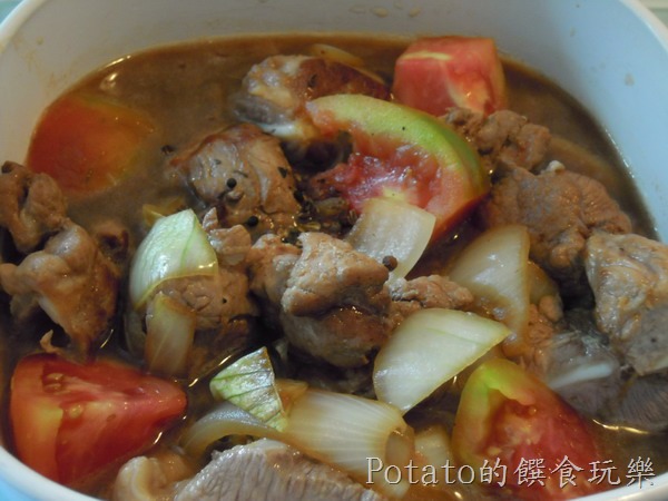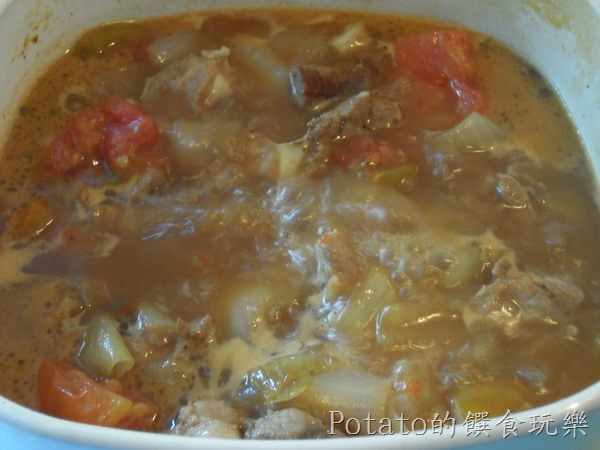 2.用一個燉鍋,將洋蔥、豬軟骨、番茄塊放入,加入水500CC、醬搖半碗、冰糖、花椒、黑胡椒粒,將湯汁煮沸後轉小火。