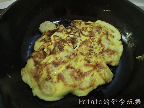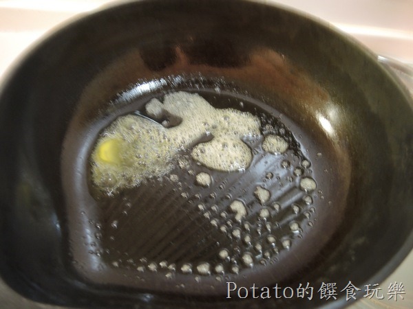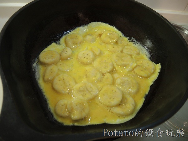 2.步驟2:鍋子預熱後,放入奶油塊,倒入香蕉蛋液。