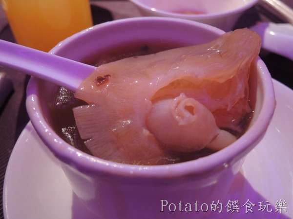 海鮮雪蛤燴勾翅:大排翅的雪蛤海鮮羹,淋上一匙紅酒醋,美味升級。