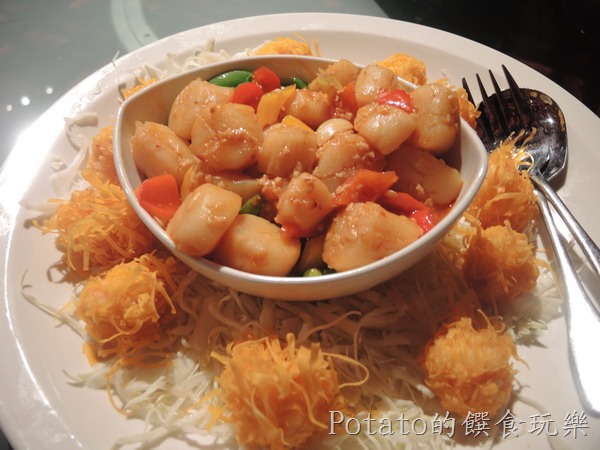 怡香鮮袋子百花球:干貝立柱炒甜豆、甜椒,清爽美味搭配上桌。