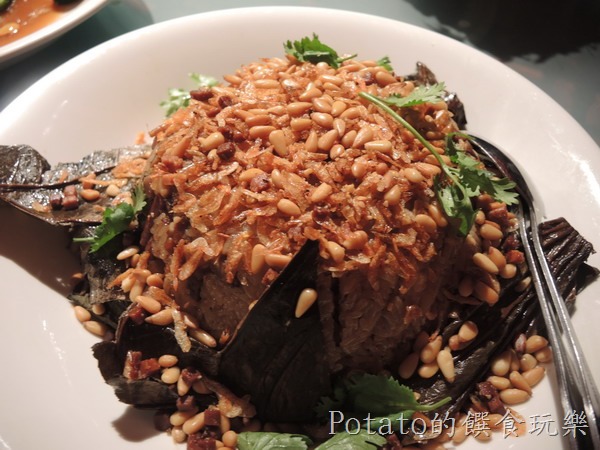 海味三寶荷葉米糕:魷魚絲、干貝絲、蝦米及米,用荷葉包裹蒸煮出來的米糕,有淡淡的荷葉清香,在撒上松子,營養美味滿分。
