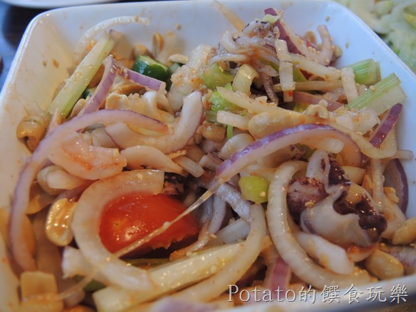 泰式檸香海鮮沙律,NT320。就是泰式檸檬沙拉,有蝦仁、花枝、花生、蕃茄、小黃瓜、洋蔥、西洋芹,加入芝麻、檸檬的醬汁,非常好吃,夏天吃這個最好。