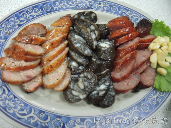 三色香腸–原味、墨魚、飛魚卵香腸,是這家店必點的菜色,墨魚香腸裡有花枝塊,飛魚卵香腸吃起來有魚卵在口中跳動的感覺,真的很好吃。