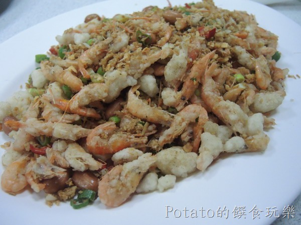 鹽酥溪蝦–溪蝦裹粉炸得酥酥的,搭配蒜酥,酥酥脆脆的。