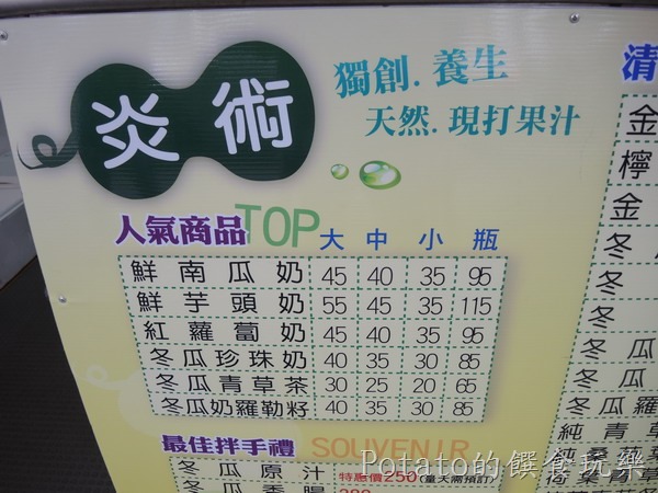 這間【炎術】飲料店算得上是南投埔里地區的飲料店奇葩,它其實是一家以冬瓜茶起家的飲料店,傳承簡單天然的古早味,後來加上老闆自己獨創的研發,為了符合現代人注重「養生」的訴求,於是採用冬瓜、南瓜、紅蘿蔔、山藥、木瓜、桑椹、芋頭、地瓜等二十多種常見的食材搭配,開發出各式各樣的養生蔬果飲料,在飲料店林立的環境下開創出自己的一片天。