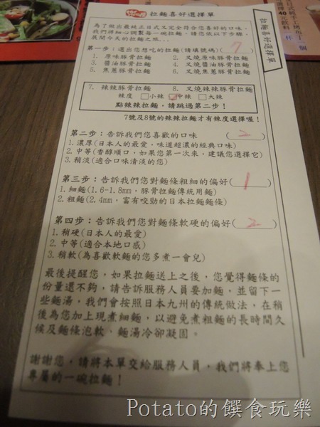 樂麵屋的點菜單有四個步驟,要依序填完後服務生會過來收單並記住你的座位。