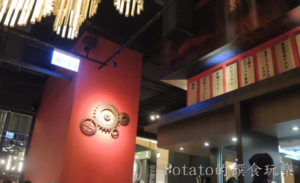 樂麵屋南港中信總部店的內部裝潢牆面以紅色系為主,牆上還有一個蠻別緻的齒輪時鐘。
