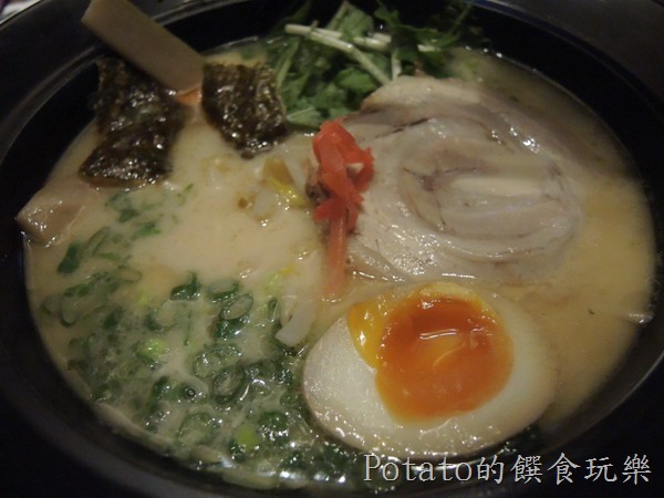 原味豚骨拉麵,NT$190。(老爺點的拉麵)薄的見光的叉燒肉,半顆溏心蛋、蔥花、紅薑,還有海苔餅乾。湯頭不是很鹹且意外的順口,蠻適合台灣人的口味。