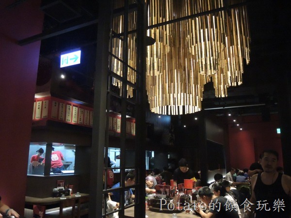 樂麵屋南港中信總部店的內部裝潢,中間有個以竹子為圍繞的燈飾,不但可以當裝飾,也可以讓燈光更柔和,不讓眼睛直視燈光,很有特色的裝置藝術。