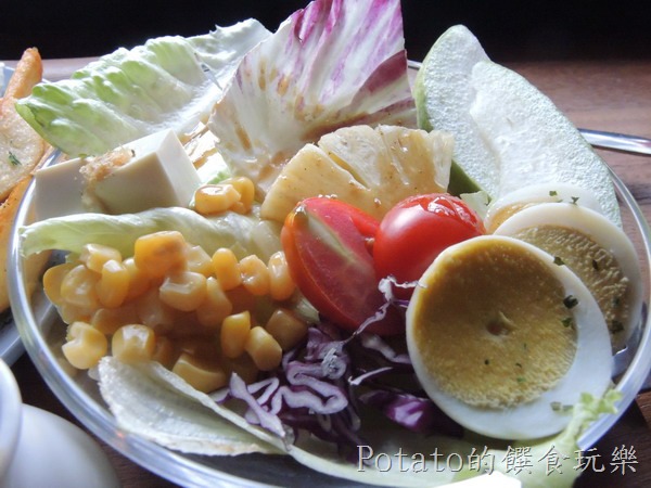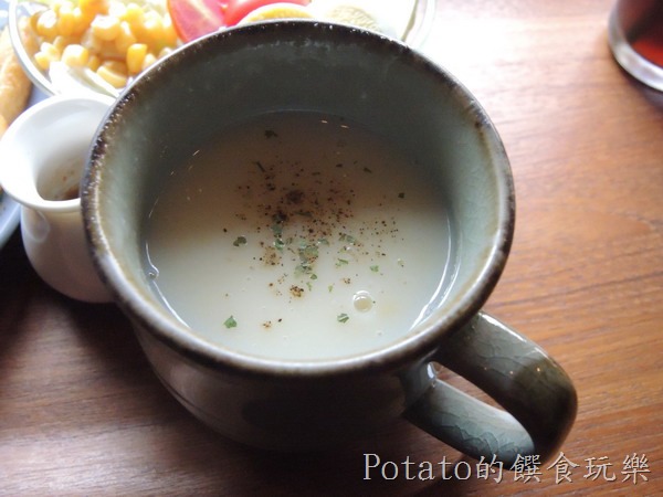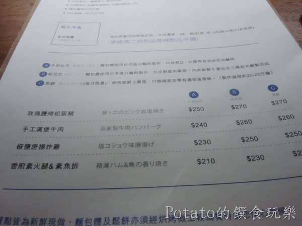 全日早午餐內容有野菜沙拉、濃湯&餐後飲品(冰熱紅茶or美式,其他補半價)麵包有3種可選,牛奶吐司、帕尼尼及煎餅。主食有4種可選,豬、牛、雞肉&素火腿魚排,主食+麵包換算下來有12種選擇。