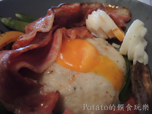 我點了一份培根薯泥球+水煮蛋:NT220元,有貝果麵包、甜點,這次沒點雞蛋仔。